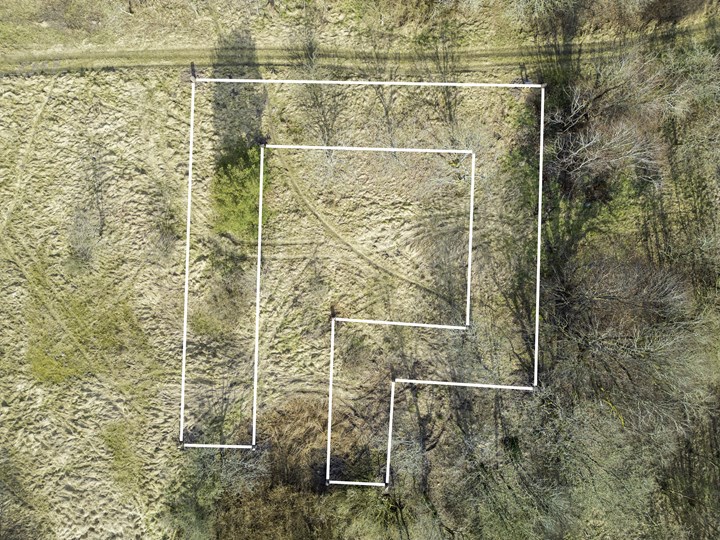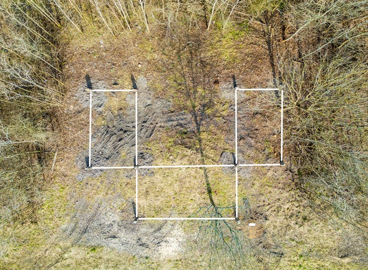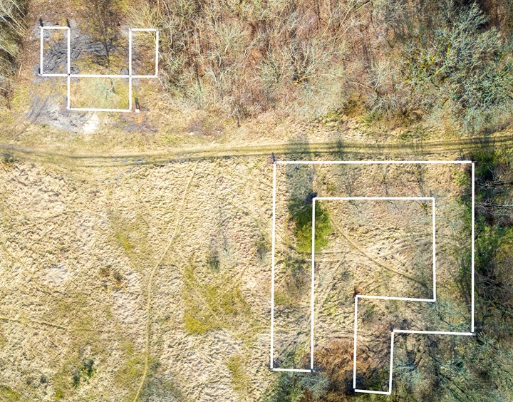 Ved hjælp af hvide streger har han forbundet granitkvadrene, der er sat for at markere bygningerne. Det giver et godt overblik over bygningernes form og placering. Når du står i området kan du desuden se sten, der er lagt ud mellem granitkvadrene for at vise bygningernes grundrids.