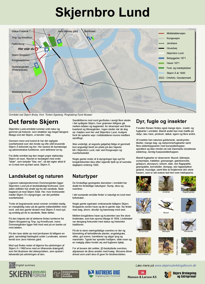 Naturen på steder er unik. Kommunen bakker op med delvis afgræsning om sommeren. Under den ældgamle skov, det sandende overdrev og den gamle, nordligste åslyngning ligger en spændende historie. Her findes jo resterne af dels Middelaldervejen, dels Kongevejen fra 1600- tallet. Tomten fra Skjern Brogaard er fundet frem, bl.a. med Torben Egebergs store hjælp. Det samme gælder resterne af Skjerns hedengangne Ting- og Arresthus.