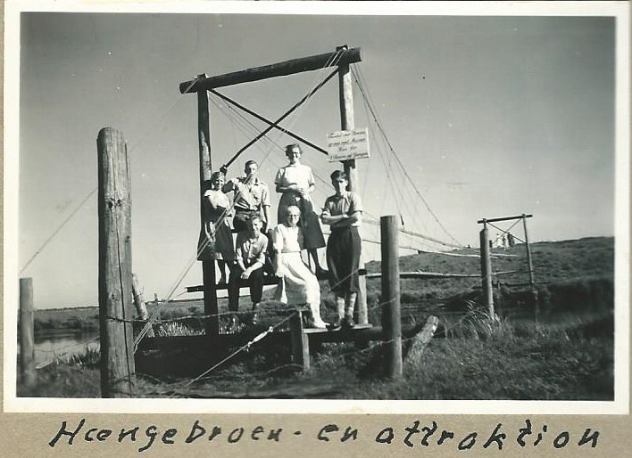 Hængebroen over Skjern Å og frem til Lundenæs Borgbanke er fra omkring 1952. Skjern Lystfiskerforening stod bag byggeriet af broen. Billedet er taget i anledning af den nye attraktion. Personerne på billedet er familien lærer Andersen, Albæk Skole. Bagerst fra venstre står børnene Ruth og Bent samt Johanne, som er søster til fru Andersen, og Poul. Siddende: Agner og Mary Andersen. Lærer Andersens yndlingsspadseretur om søndagen gik fra skolen ned til broen, over broen og langs den sydlige bred til Albæk bro og videre til skolen. Lærer Andersen døde i 1966. Albæk skole lukkede i sommerferien 1966. Billedet er fra arkivet på Ringkøbing Fjord Museer.