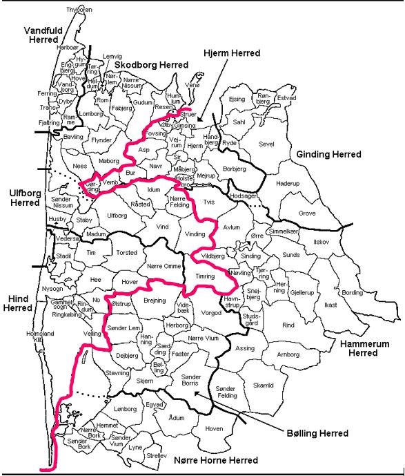 Kort over Hardsyssel + Nørre Horne Herred, som dækkede det senere Ringkøbing Amt. Desuden ses de ni herreder samt sogne og købstæder fra før 1970.