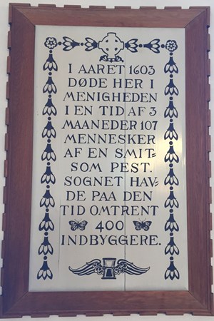 I Skjern Kirke er der ophængt en tavle, hvorpå der står følgende: ”I året 1603 døde her i menigheden i en tid af tre måneder 107 mennesker af en smitsom pest. Sognet havde på den tid omtrent 400 indbyggere.”