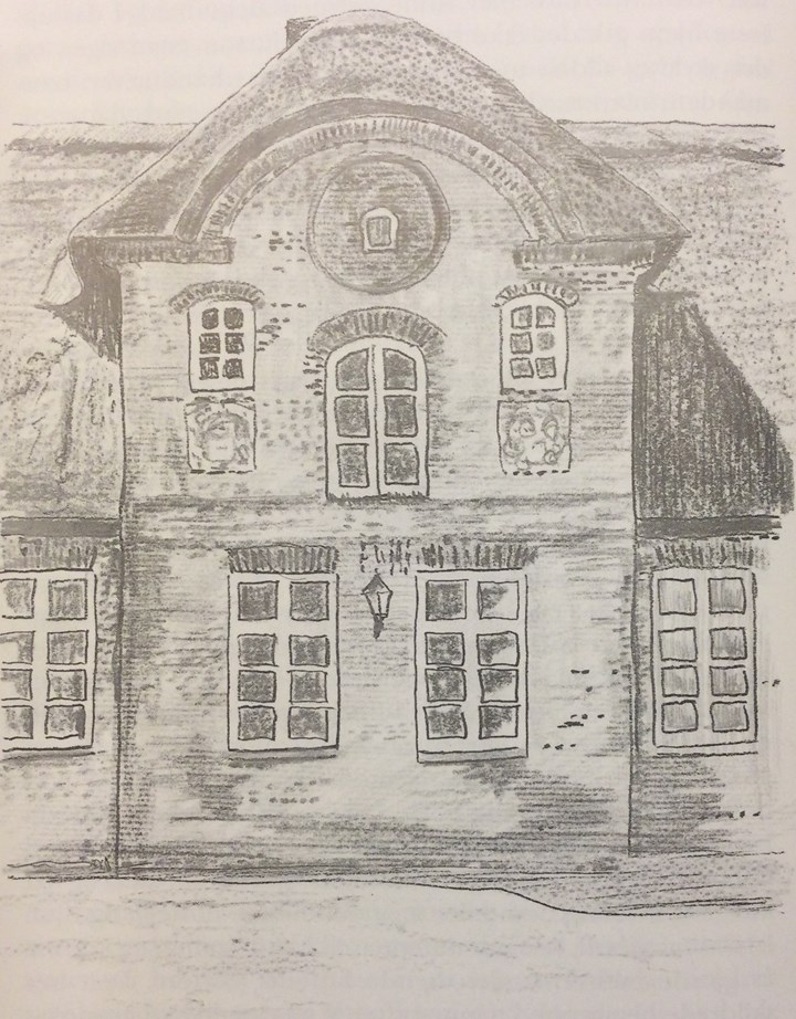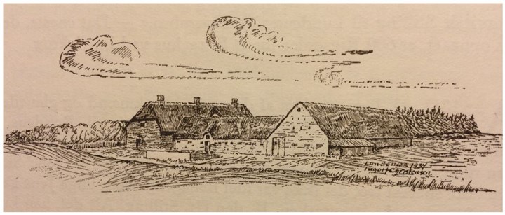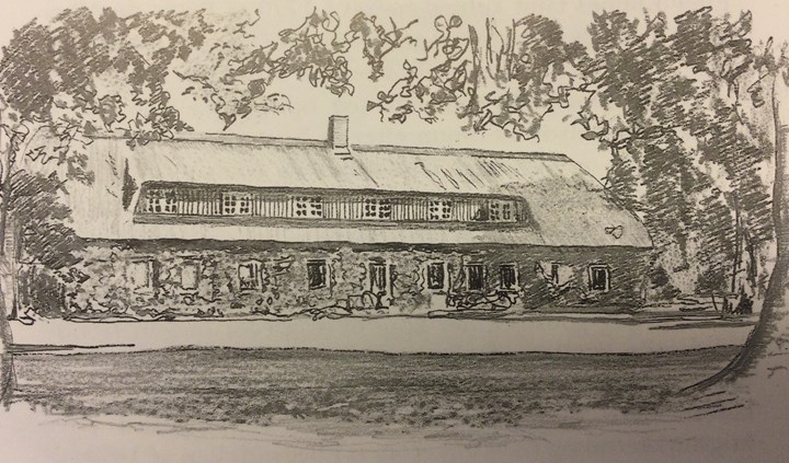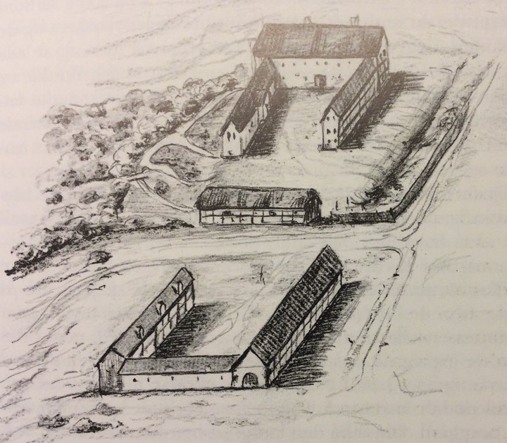 Lundenæs. Avlsbygningerne udskiftede Niels Holt Sørensen med moderne bygninger efter overtagelsen i 1956. Kun hovedbygningen fik lov at blive. Tegnet af Ingolf Christensen i 1934.