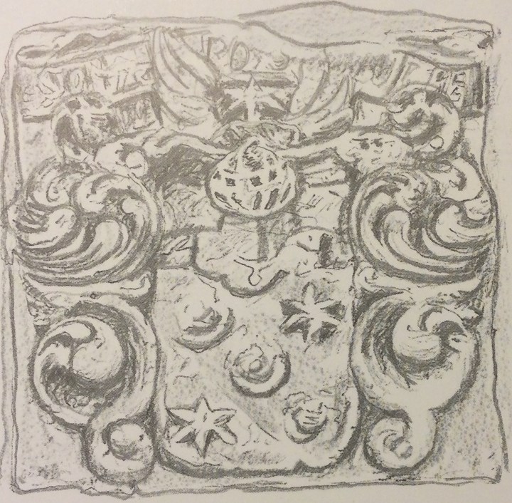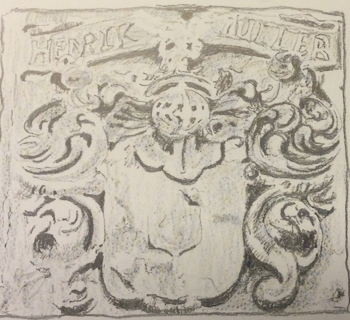 Sandstensfriser. Våbenskjolde over Sofie Rosenstjerne og Henrik Müller sidder som sandstensfriser i murværket i gårdsiden på Lundenæs.