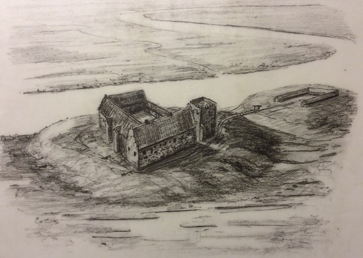 Lundenæs Slot med en vindebro over til slotsgården mod øst og Skjern Å med sit snoede forløb nord om slottet. Peder Svendsens tegning er fra bogen ”Vestjyske fortællinger og sagn”, bind 5 af Jon Høgh.