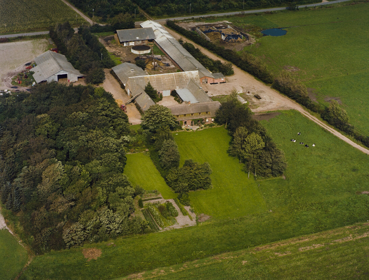 Lundenæs 1978-80. Niels Holt overtog Lundenæs i 1956, nedrev flere af de gamle avlsbygninger og opførte nye bl.a. denne lange kostald. Foto: Sylvest Jensen, Det Kongelige Bibliotek.