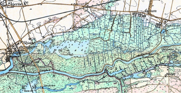 Topografisk kort 1870-1899 med Skjern Å nord om voldstedet for Lundenæs Slot, indtil det i 1621 flyttedes op til ladegården øst for Aanum. Bemærk, at Omme Å løb ind i Skjern Å nogle hundrede meter vest for Lundenæs Voldsted. Stedet for sammenløbet kaldtes Haugmunde. Som det fremgår af kortet, havde Omme Å også udløb til Tarm Sø. Indtil 1840 havde Omme Å kun udløb til Tarm Sø, som var forbundet med søer vest herfor med et senere udløb i Skjern Å. Til venstre på kortet ses hovedvejen fra 1850 og Jernbanen fra 1875. I nordvest Petersminde, Skjern Brogaard, Bomhuskroen og mod nord Damsø.