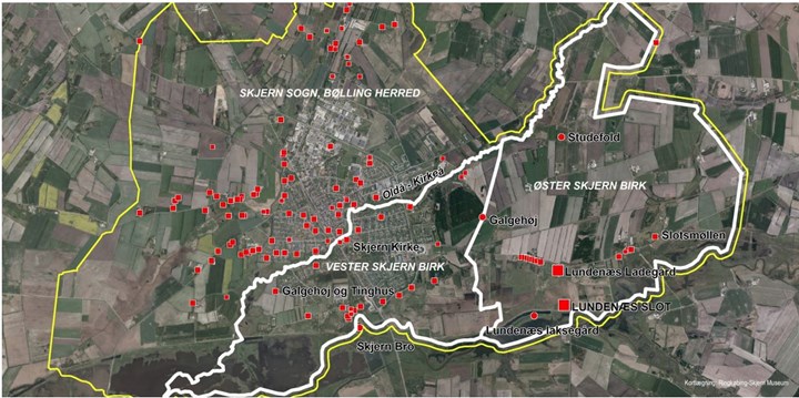 Her i nærheden af Skjern Brogaard har der ifølge Resens Atlas fra ca. 1677 været en galgehøj og sandsynligvis også allerede dengang et tingsted. Skjern Sogn er tegnet med gul streg. Bondegårde omkring år 1800 er angivet med røde kvadrater. En gravhøj med navn Galgehøj ligger på skellet mellem Vester Skjern Birk og Øster Skjern Birk. Galgehøj i Vester Birk er angivet nord for Skjern Brogaard med tingsted tæt herved. Korttegning: Ringkøbing-Skjern Museum.