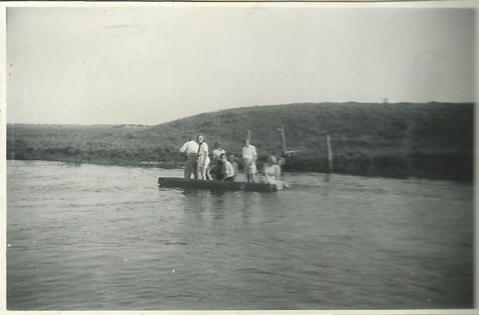 Billedet af trækfærgen over Skjern Å er fra omkring 1950. Lærer Andersen fra Albæk Skole trækker færgen. I 1952 blev trækfærgen afløst af hængebroen på nederste billede. Skjern Å’s forløb var indtil udretningen i 1960’erne nord om Lundenæs Vold. Billedet er fra arkivet på Ringkøbing Fjord Museer.
