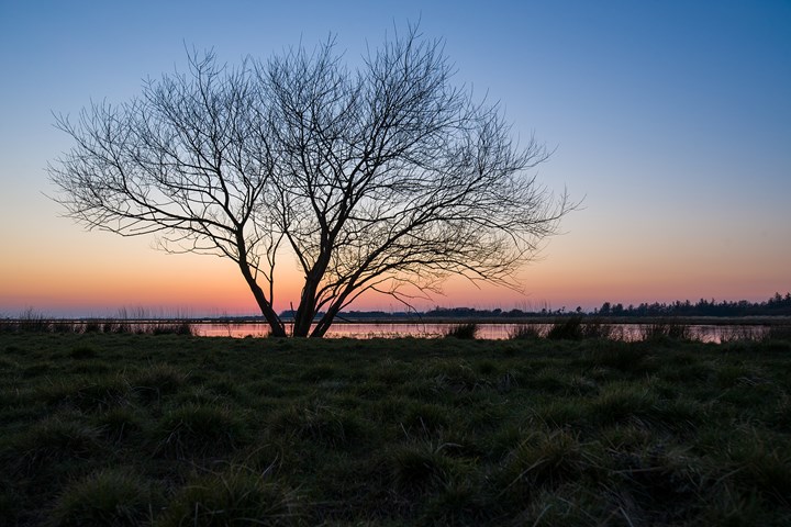 Motiv: Træ ved Skjern å set mod solnedgang, 150 m sydvest for Kong Hans bro, taget 27. marts 2020, kl. 19.02