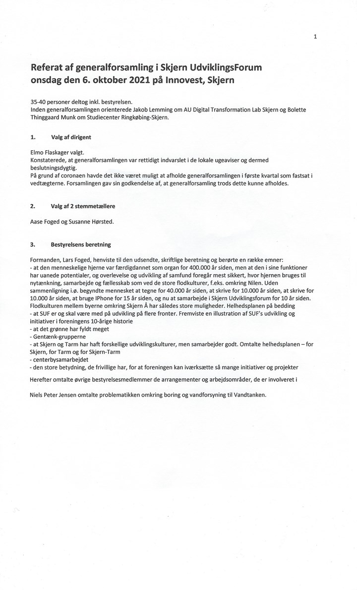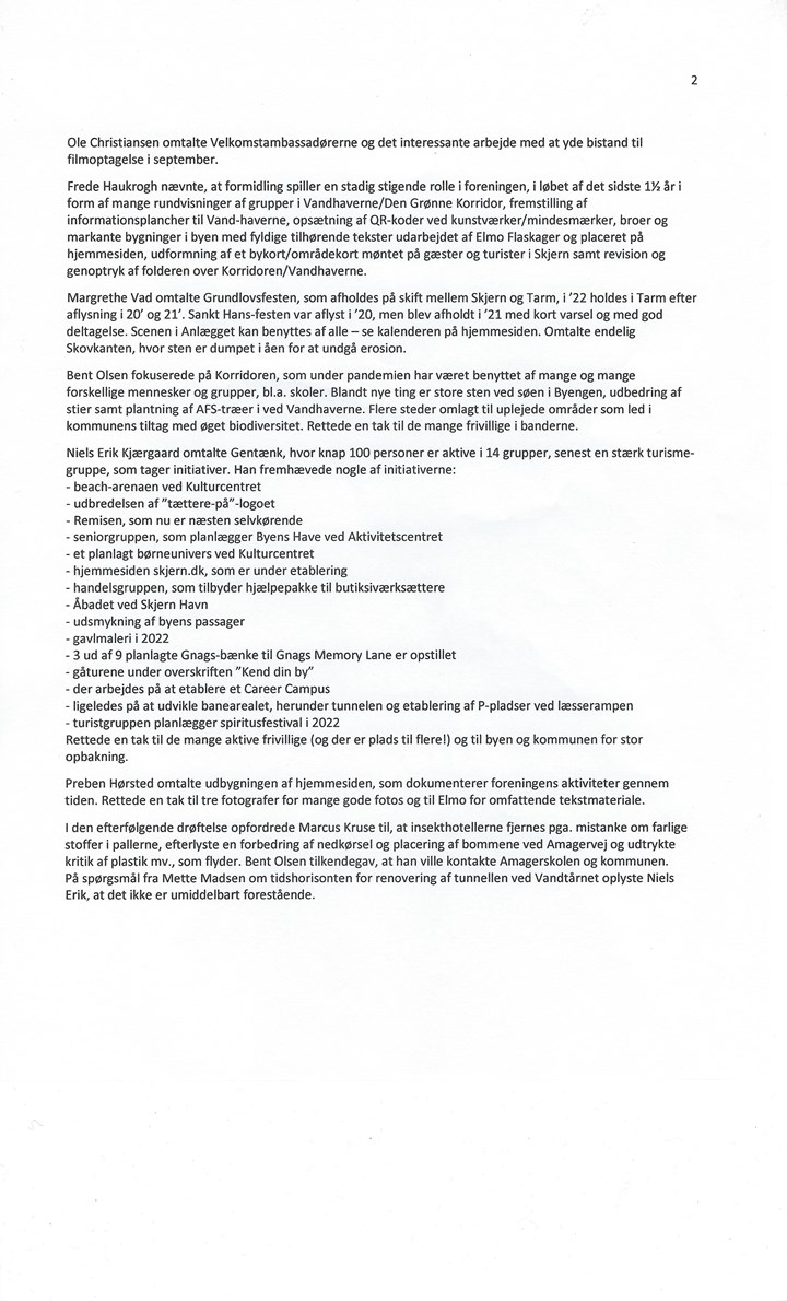 Kører for fulde gardiner. Der en 10-15 grupper i sving og det ene og det andet større eller mindre projekt ser dagens lys. Remisen kører nu solo. Åbadet på samme vej. Turismegruppen har allieret sig med Tarmfolk og dækker fornuftighedsvis hele egnen med den slagkraft det giver. ”Tættere på” fra Brandinggruppen er blevet et kendt slagord. Det Grønne Skjern-gruppen barsler med forslag til forskønnelse af indfaldsveje og Ringvejen, og kunstgruppen arbejder seriøst med Skjerns 11 ”passager”, der ligesom Skjerns skønne Broer og Skjerns tunneler binder byen sammen. Man tænker også i en ”Verdensmålsrelateret gavlkunst. Og vi kunne blive ved . Niels Erik Kjærgaard vil supplere på generalforsamlingen.
