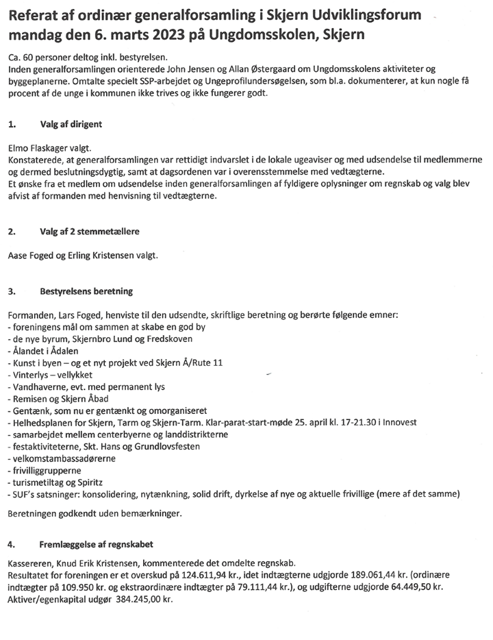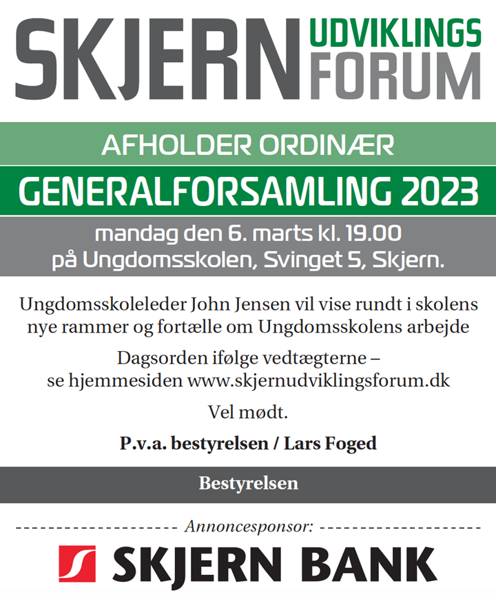 Skjern Udviklingsforum forsøger i al beskedenhed at tage sig af det nære. Corona, som fyldte alt de sidste par år, har sluppet sit tag. Krigen i Ukraine og andre udfordringer har taget over. Vi spiller sammen med andre foreninger om at skabe det lokale ”gode liv”. Det holder i hvert fald modet oppe hos bestyrelsen og formanden, som sammen takker for stor opbakning og støtte fra de godt 600 medlemmer og alle sponsorer!