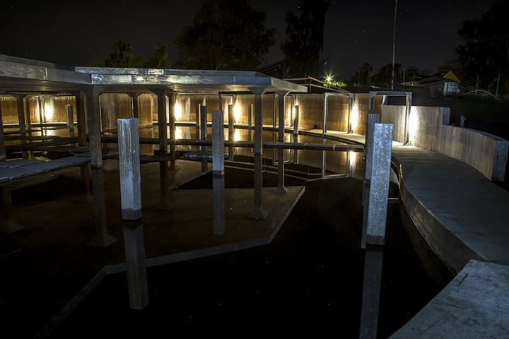 - Frode Madsens Broer, som smyger sig med ryggen mod hinanden under hængepilen og i materialer af stål og vejrbidte egeplanker spiller op til pardans med hinanden. Lys på broerne om natten fuldender stilen.