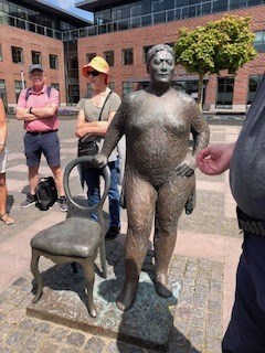 Vi sluttede på Banegårdspladsen, her så vi studenterstien og vandskulpturen, dog uden vand..., den symboliserer Skjern å og Ringkøbing fjord.