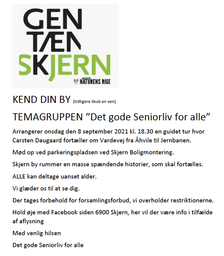 Onsdag den 27.5.2021 kl. 18.30 er der planlagt en guidet gåtur med start fra det gamle æggepakkeri i Bredgade. Hold øje med Skjern Update for nærmere oplysninger.