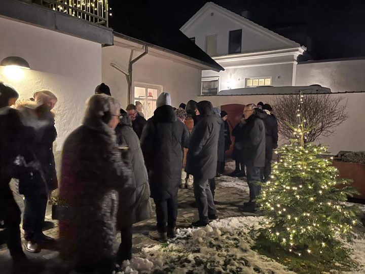 Aftenen sluttede i Lene Sikjærs hyggelige gårdhave. Her var der varm gløgg og tændt bål, ligesom juletræet glimtede smukt.