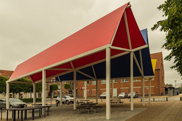 I et facebookopslag skriver Skjern UdviklingsForum, at det var Per Arnoldis ide at kreere ”to overdækninger på lette søjler med farvestrålende tag af foldede plader og med sider, der kan påmonteres plexiglasplader for at skabe læ”.