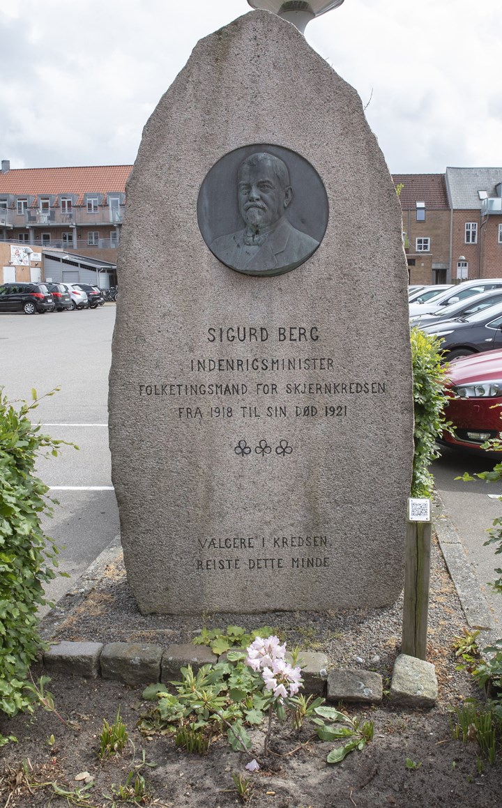 Mindestenen med en bronzeportræt-relief af Sigurd Berg blev afsløret den 9. juli 1923 på Banegårdspladsen i Skjern. For at give plads til Skjerns nye rutebilstation blev stenen den 3. marts 1958 flyttet til Skjern Anlæg og havde sin plads her, indtil den i 2004 fik sin nuværende placering.