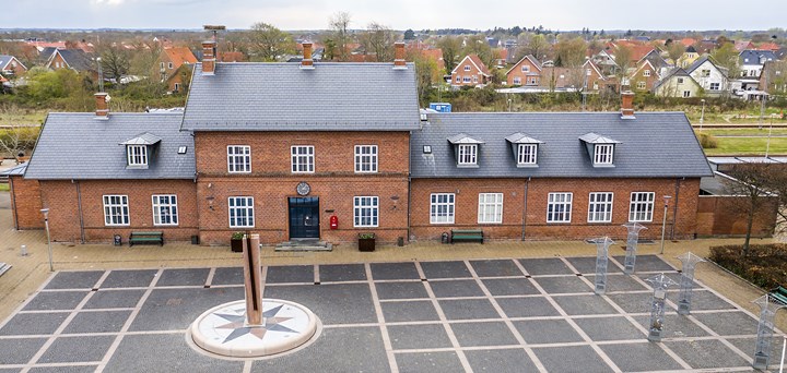 Til et jernbaneknudepunkt hører en banegårdsbygning. Det første forslag til placering var ved DSB’s vandtårn, men bygningen blev af en eller anden grund trukket mod syd og bygget på den grund, hvor det gamle posthus i 1940 blev opført, Bredgade 67, og i dag som domicil for advokatfirmaet Kirk Larsen & Ascanius. Men da tværbanen fra Skanderborg til Skjern blev taget i brug i 1881, var der brug for en større banegårdsbygning, og DSB anlagde den bygning, vi kender i dag.
